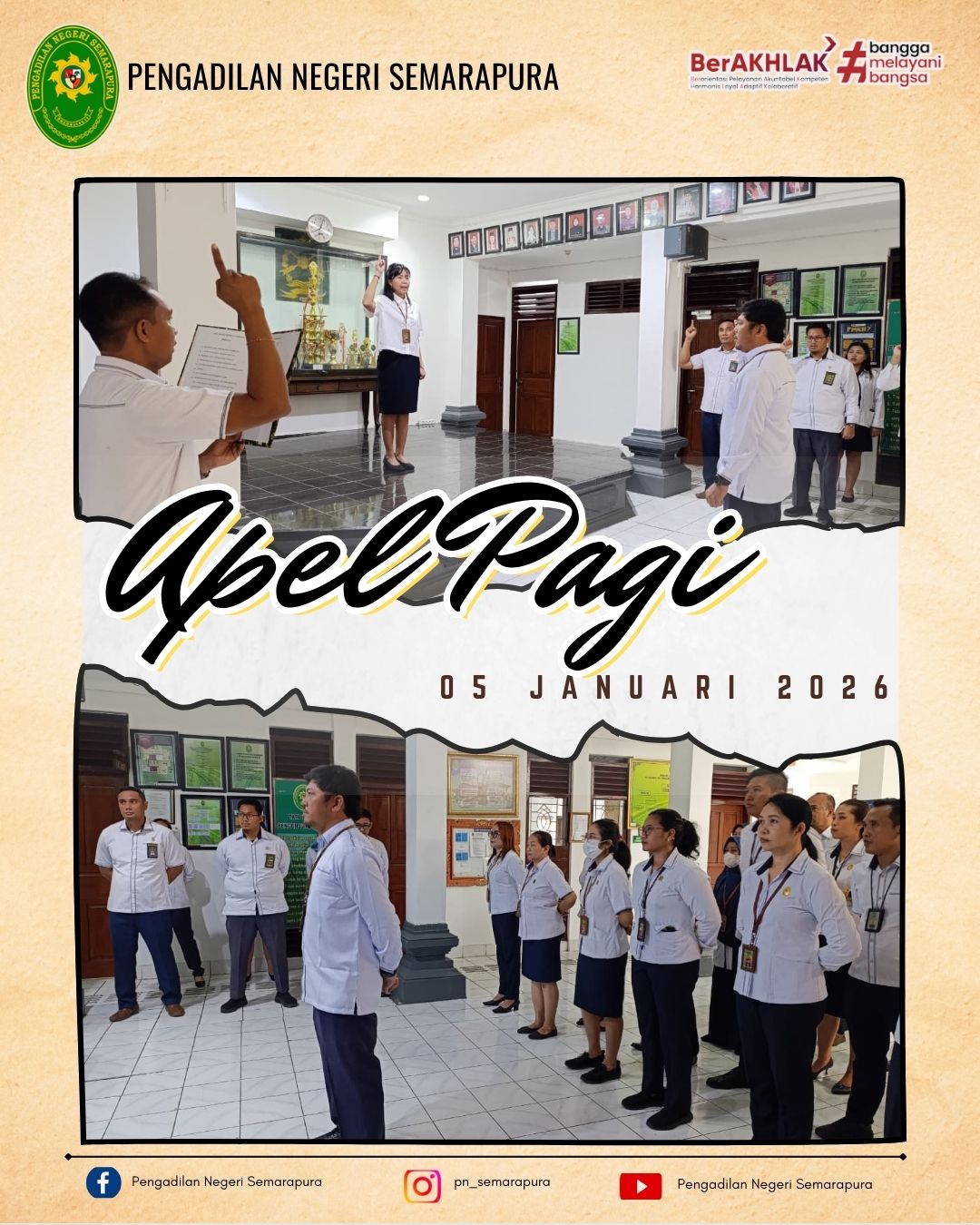 Bertempat di halaman kantor Pengadilan Negeri Semarapura telah dilaksanakan Apel Pagi, sebagai Pembina Apel adalah Ketua Pengadilan Negeri Semarapura Ibu Ratih Kusuma Wardhani, S.H.,M.H., sebagai Petugas Apel dari bagian Kepegawaian Organisasi dan Tata Laksana, apel diikuti oleh seluruh Hakim dan Aparatur Pengadilan Negeri Semarapura. Dalam amanatnya pembina apel menyampaikan untuk menyelesaikan penginputan SKP Triwulan IV, agar tetap semangat dalam bekerja, menjaga disiplin, mematuhi PERMA Nomor 7,8,9 Tahun 2016, serta selalu menerapkan Delapan Nilai Utama Mahkamah Agung RI, dan tetap berpedoman kepada Core Value ASN BERAKHLAK.
