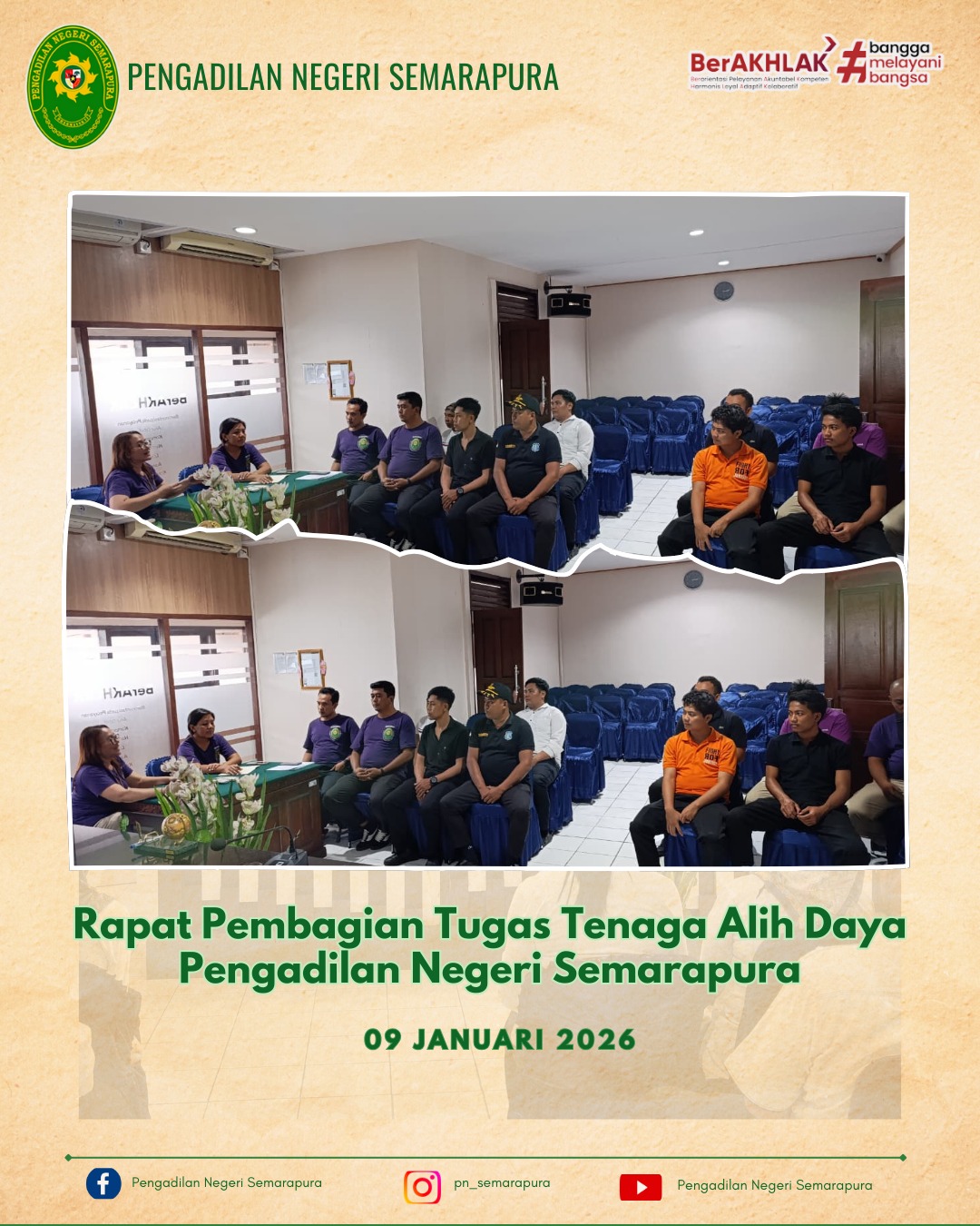 Sekretaris Pengadilan Negeri Semarapura Ibu Sopiah, S.H., beserta Tim, melaksanakan Rapat Pembagian Tugas Tenaga Alih Daya Pengadilan Negeri Semarapura, bertempat di ruang rapat Pengadilan Negeri Semarapura.