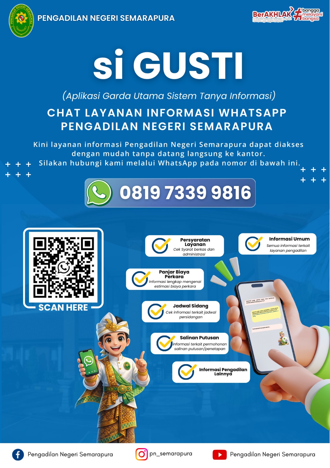 si GUSTI adalah Aplikasi Garda Utama Sistem Tanya Informasi. Kini layanan informasi Pengadilan Negeri Semarapura dapat diakses dengan mudah tanpa datang langsung ke kantor.