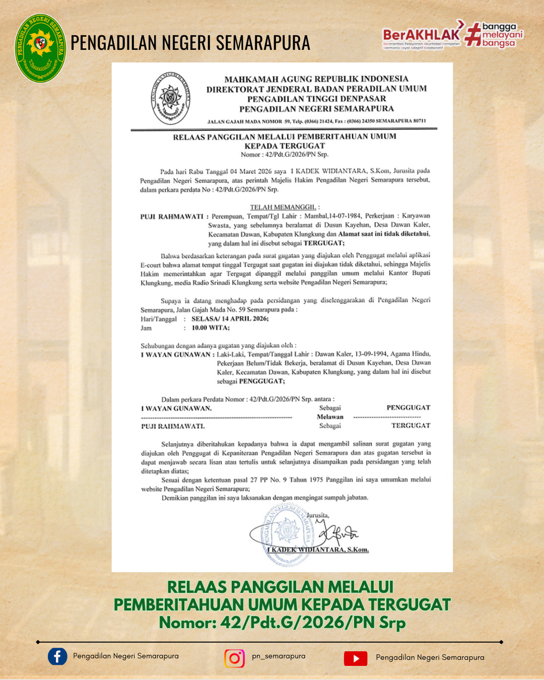 RELAAS PANGGILAN PEMBERITAHUAN UMUM KEPADA TERGUGAT Nomor 42/Pdt.G/2026/PN.Srp