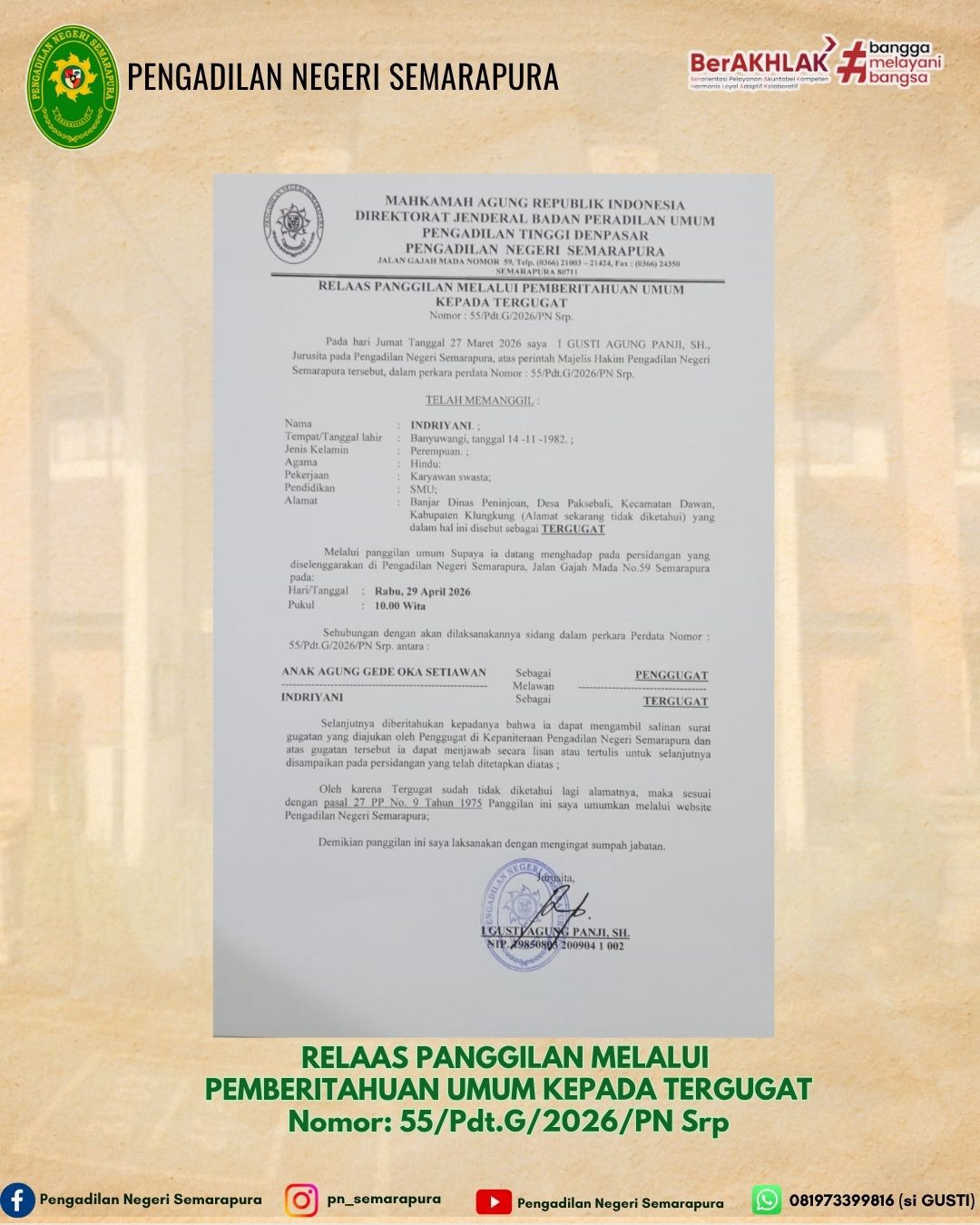 RELAAS PANGGILAN MELALUI PEMBERITAHUAN UMUM KEPADA TERGUGAT NOMOR 55/Pdt.G/2026/PN.Srp